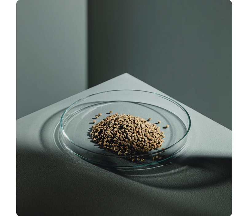Harina de camarones, arroz, guisantes, proteína de insectos, espirulina, algas, espinacas, col rizada, garbanzos, aceite de salmón, moringa, mezcla de hierbas medicinales, zanahorias, aceites herbales, prebióticos, probióticos