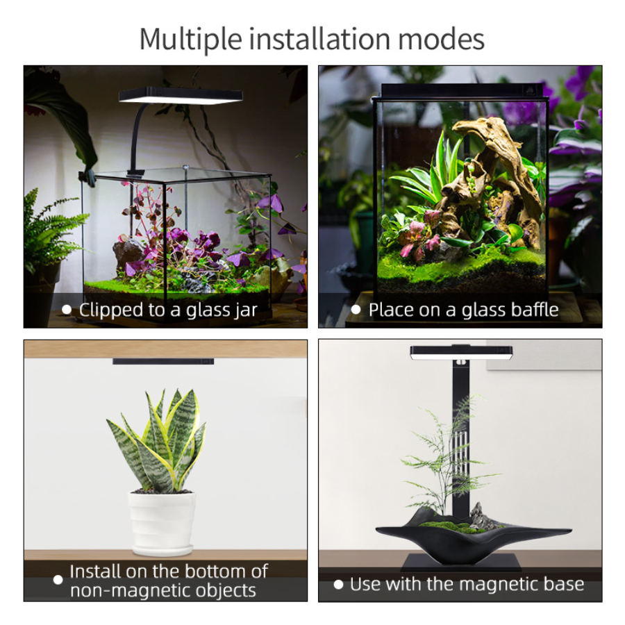 Pantalla LED compacta Week Aqua Mini9Pro, diseñada para nano acuarios y terrarios de hasta 30 cm. Alimentación USB y sistema RGB + UV Full Spectrum optimizado para potenciar el crecimiento de plantas acuáticas y realzar los colores del paisaje. Brazo flexible con sujeción magnética permite múltiples configuraciones de montaje en escritorios, vitrinas y urnas. Solución versátil y de bajo consumo para proyectos de aquascaping en espacios reducidos.