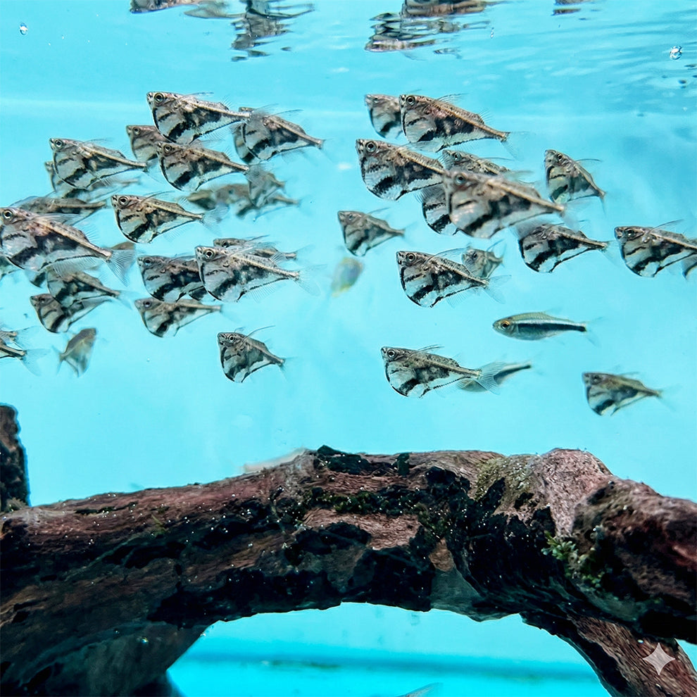 El pez hacha mármol Carnegiella strigata es un omnívoro ideal para tu acuario. Suministra alimento vivo como larvas de mosquito e insectos. Además, acepta todo tipo de alimento, como comida seca, siempre que esté en la superficie.